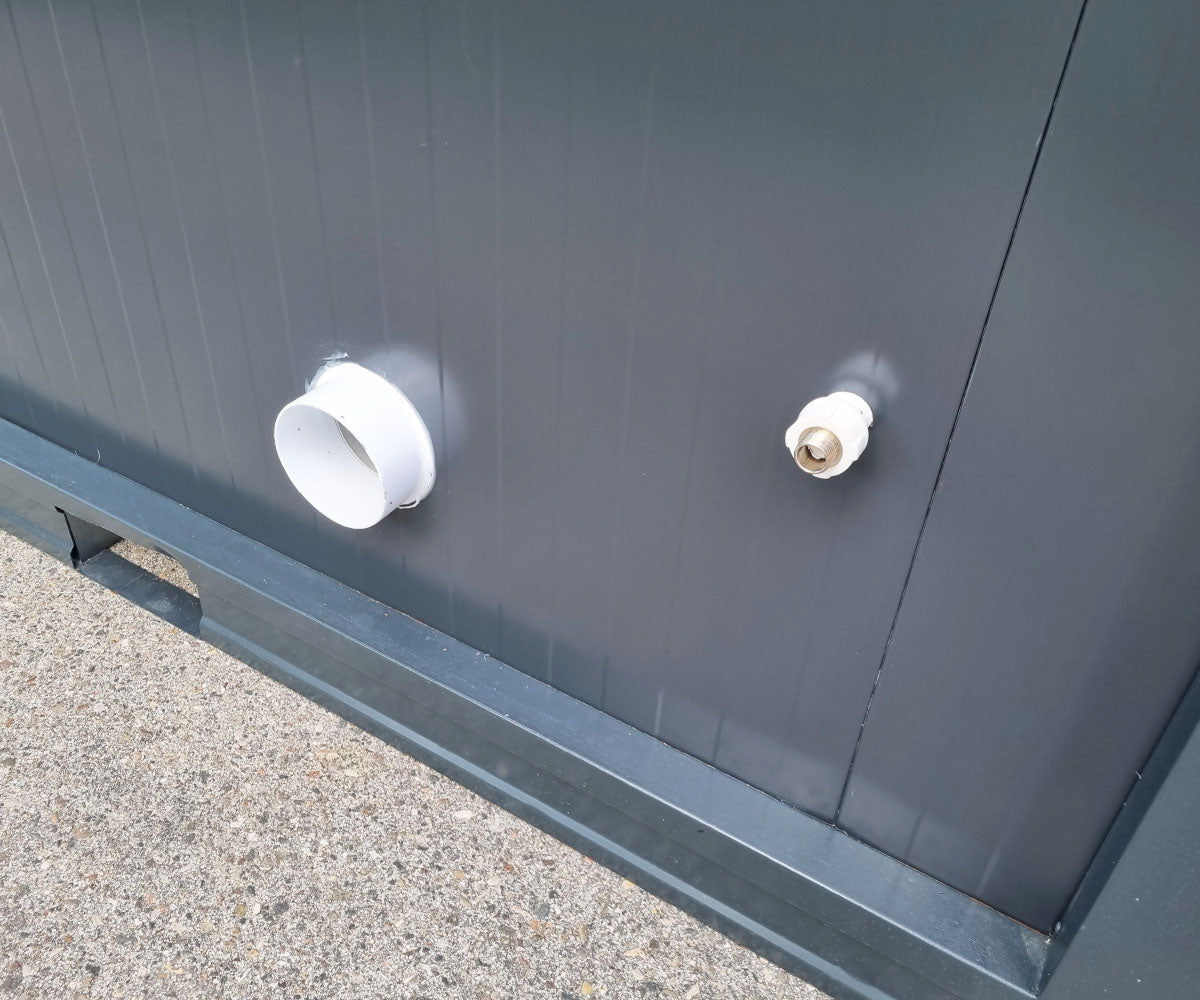 Unser behindertengerechter Sanitärcontainer bietet eine vollständig ausgestattete Anlage in einem modernen Design mit der zeitlosen Farbe RAL 7016 – Anthrazitgrau. Der Container ist komplett fertig montiert und beinhaltet ein WC mit Haltegriffen, einen Spülkasten, ein Urinal sowie ein Waschbecken mit Wasserhahn. Die lange Rampe ermöglicht ein problemloses Einfahren mit einem Rollstuhl. Durch die Abmessungen haben Sie genug Platz und können sich bequem und frei im Container bewegen.