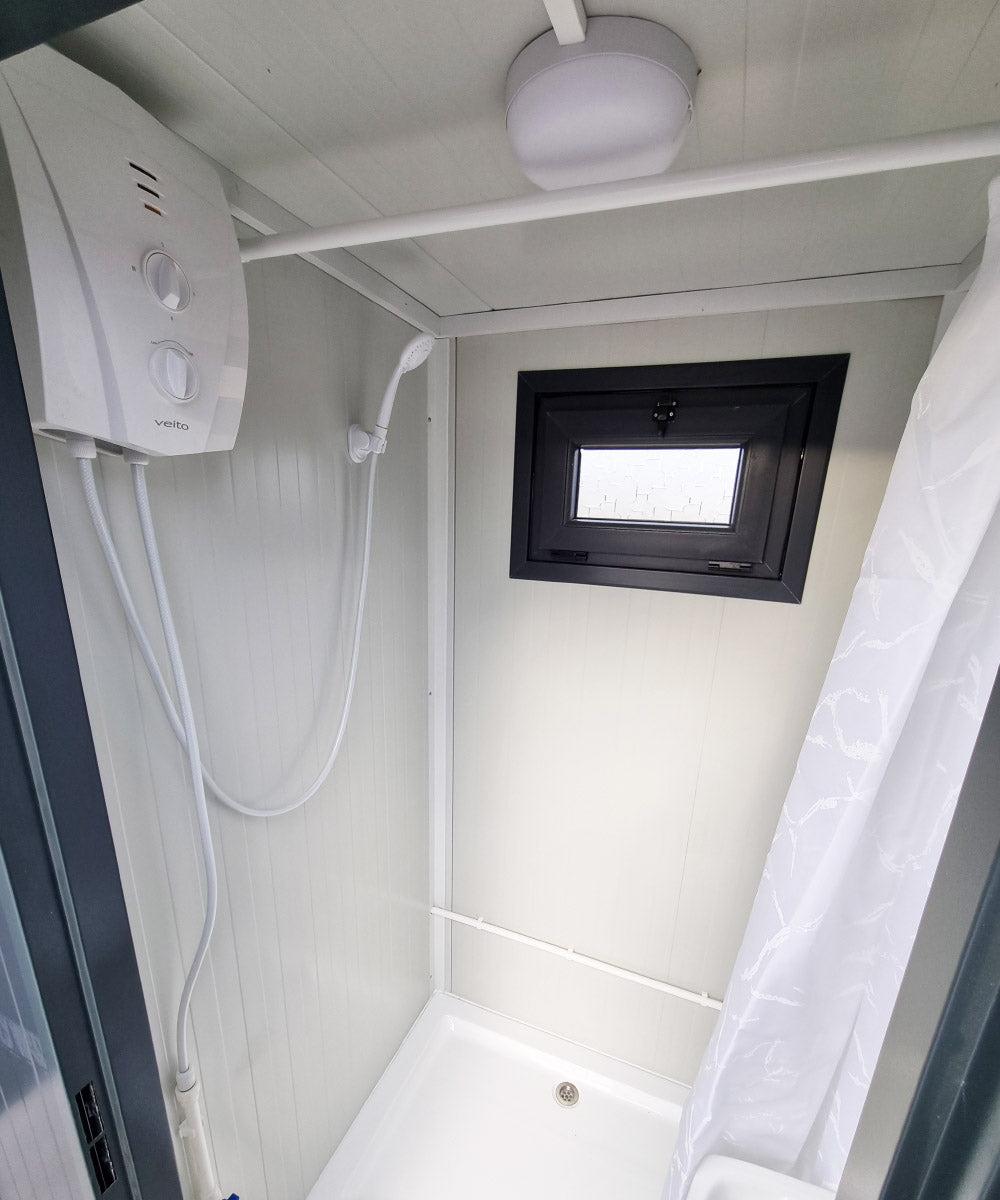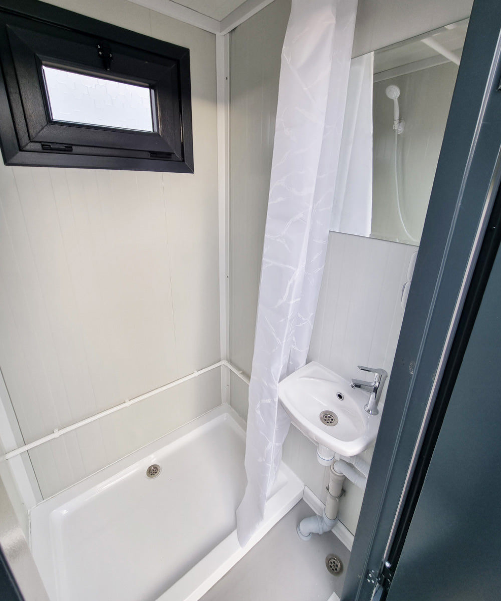 1x Dusch- und Sanitärcontainer – Doppelkabine, RAL 7016, mit Durchlauferhitzer