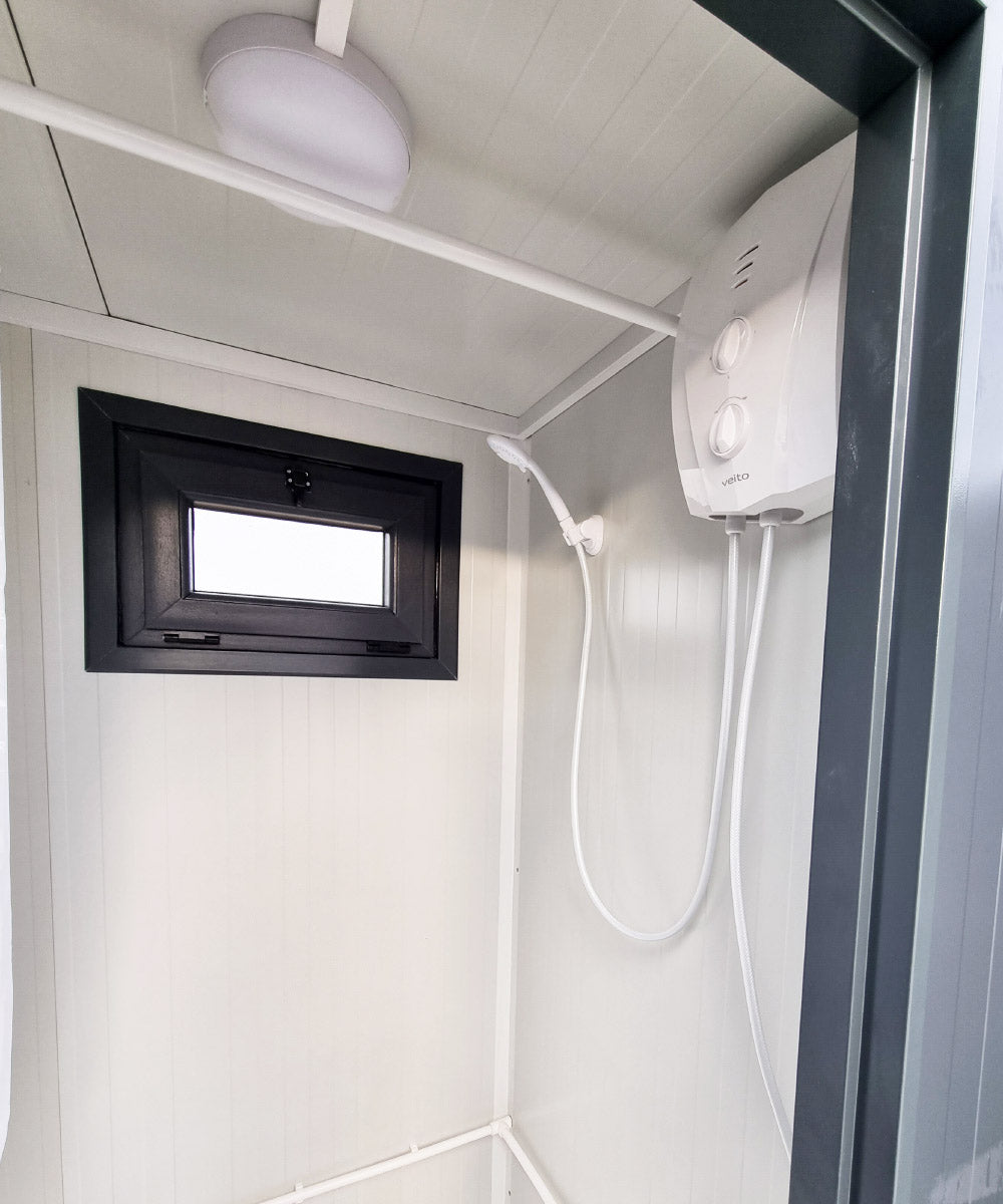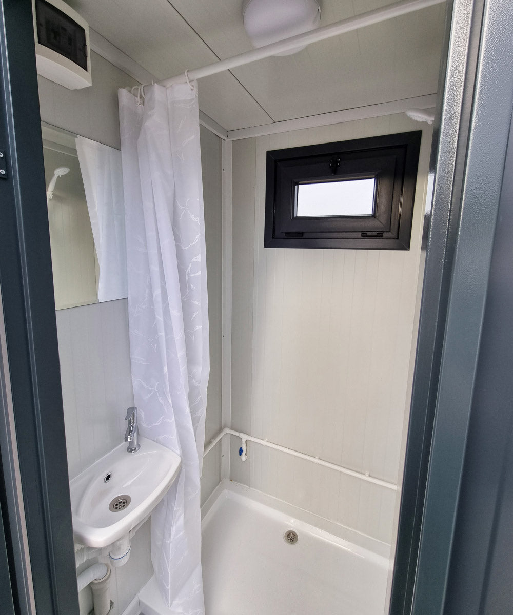 Die Duschkabinen bieten Privatsphäre dank Duschvorhang, während Durchlauferhitzer für sofort warmes Wasser sorgen. Integrierte Waschbecken mit Spiegel, Beleuchtung (Deckenleuchten), Steckdosen für Föhn, Ladegeräte oder andere Elektronik sowie zwei Kabinen mit robusten Stahltüren inklusive Schloss ermöglichen eine komfortable Nutzung auf Baustellen, Campingplätzen, Events und anderen Standorten.