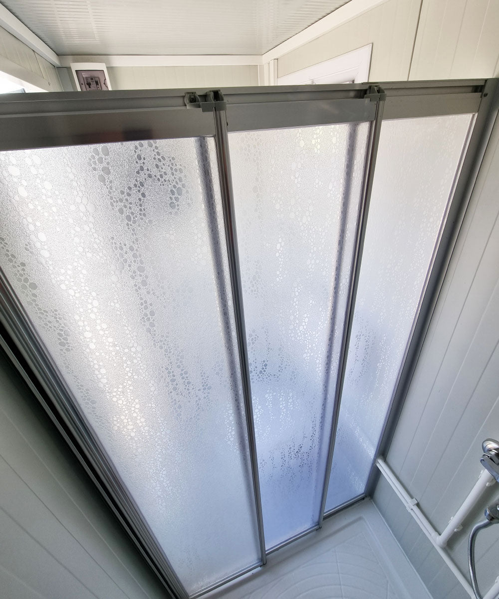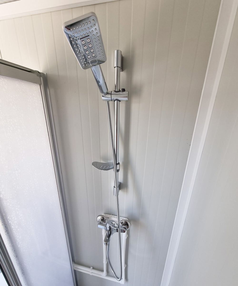 – Komplett ausgestattet: WC, Waschbecken, Duschkabine, Durchlauferhitzer (Warmwasser), Spiegel, Steckdosen, Lichtschalter und Deckenleuchte