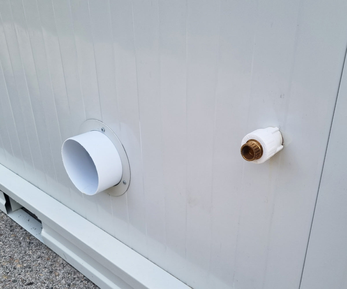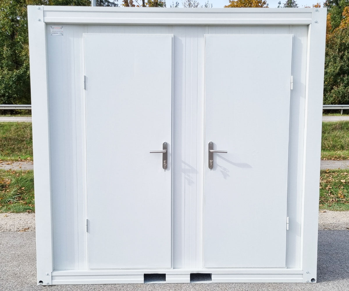 Die Türen des Containers sind aus robustem Stahl gefertigt und verfügen über einen Türgriff mit Schloss sowie 2 Schlüssel pro Kabine. Das Durchgangsmaß beträgt 65 x 190 cm (B x H). Zusätzlich ist der Container mit einem PVC-Fenster ausgestattet, das ca. 60 x 40 cm misst.