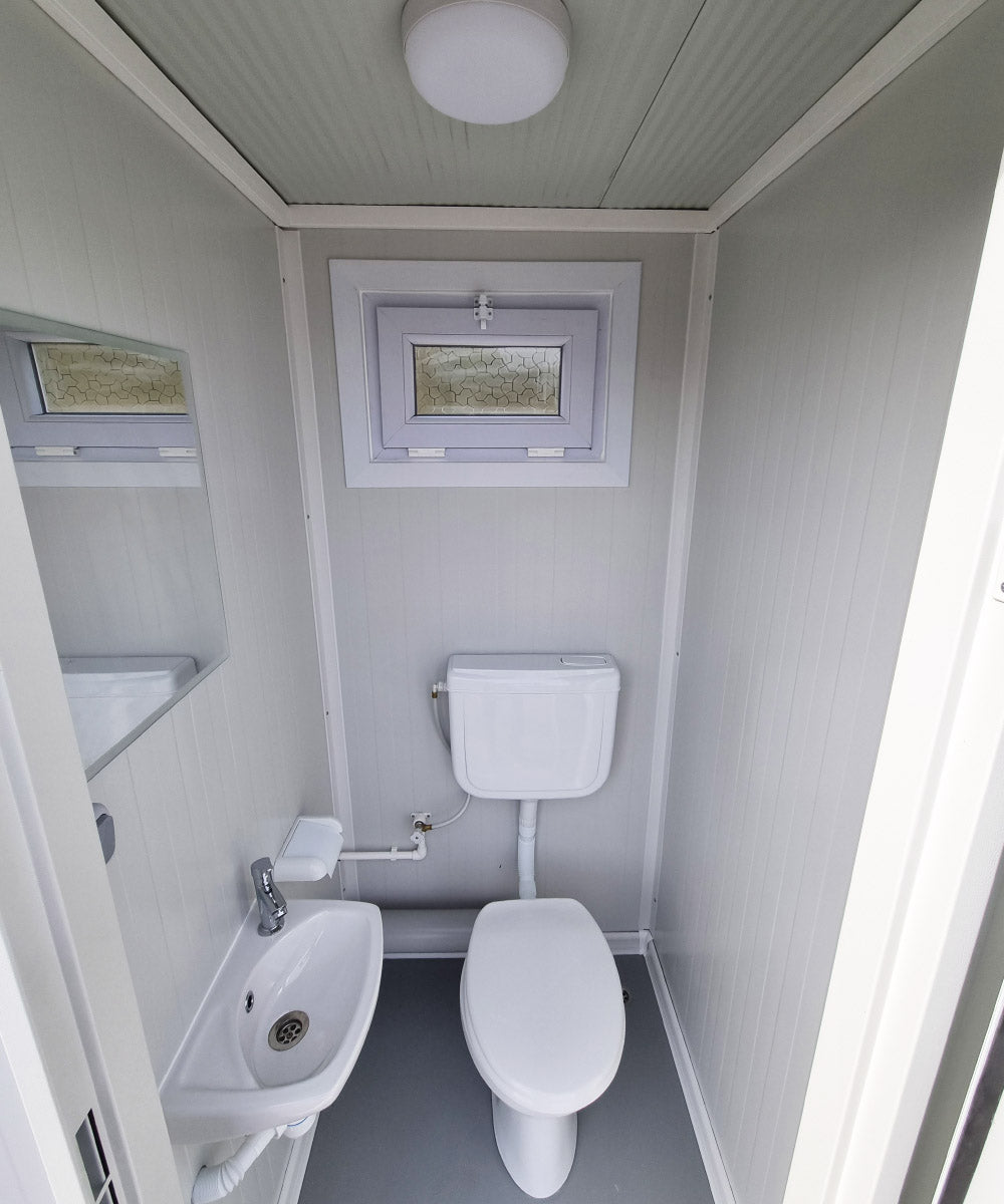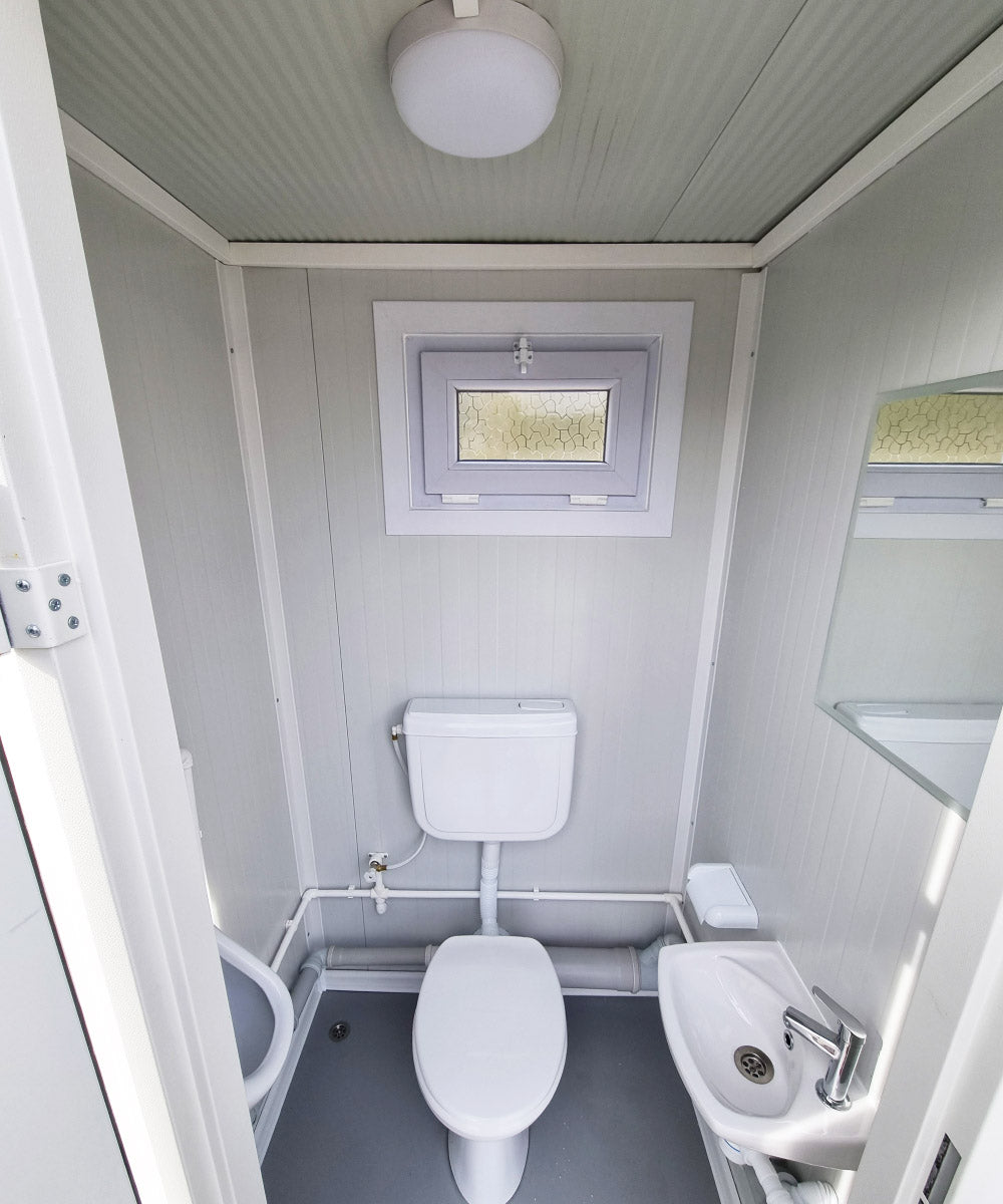 Entdecken Sie unseren WC Sanitärcontainer mit Doppelkabine in RAL 9002 Weiß. Perfekt ausgestattet für Männer und Frauen, ideal für Baustellen, Veranstaltungen und private Feiern.