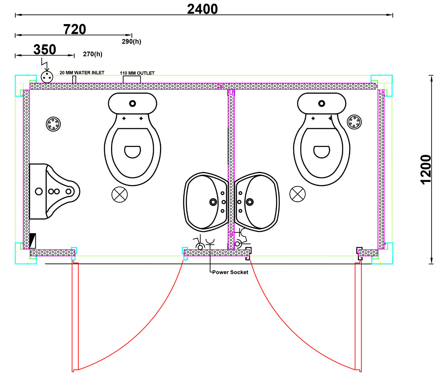 Abmessungen innen Damenkabine: ca. 100 x 90 x 210 cm (L x B x H)